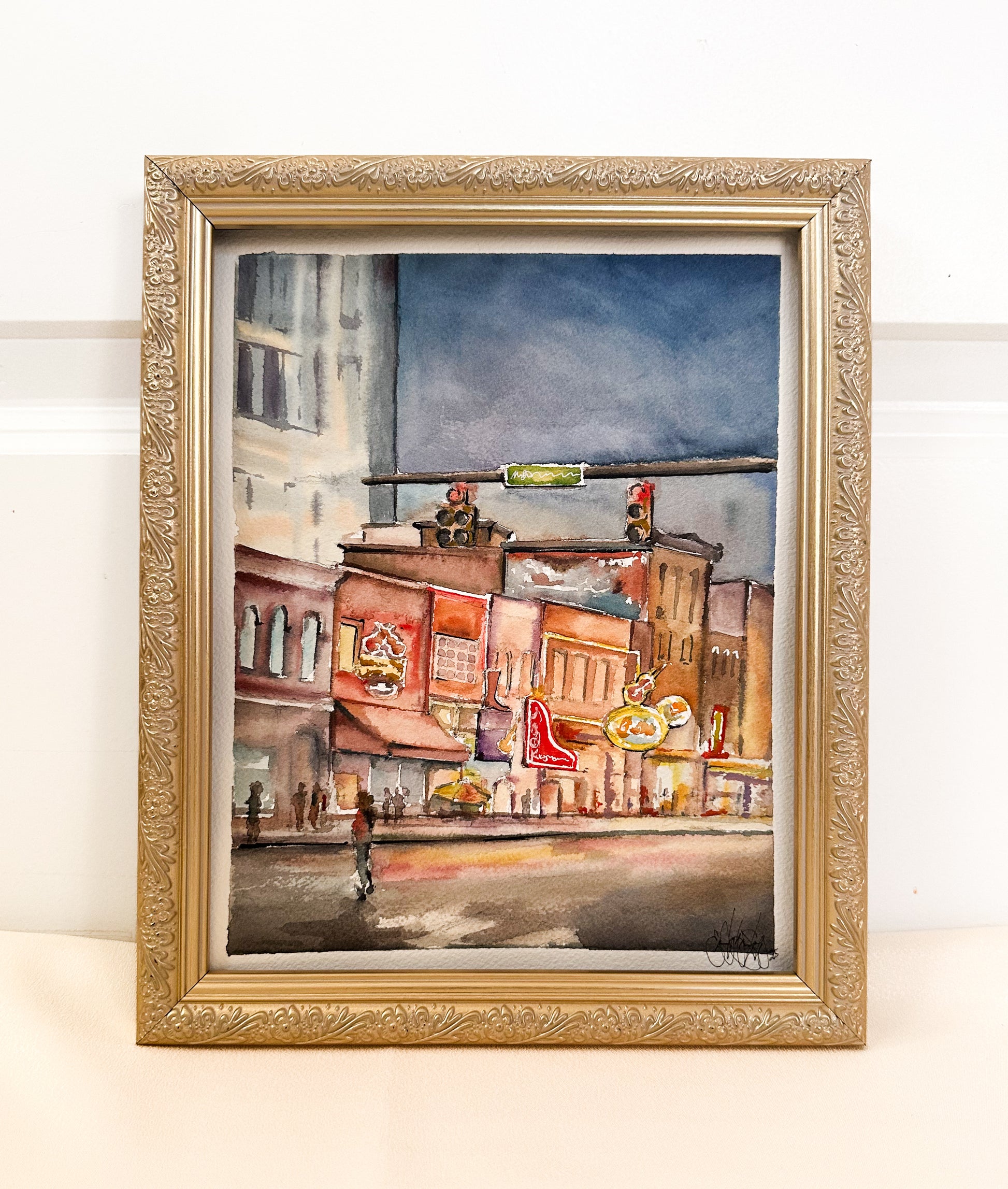 8x10 inch Watercolor print of Broadway Street in Nashville, Tennessee. Frame is not included.